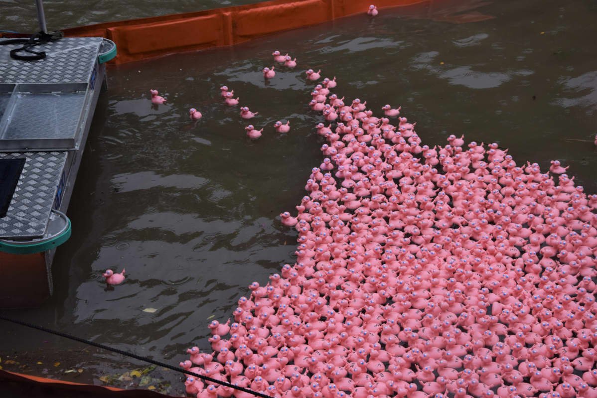 Úszóversenyt manapság gyakran rendeznek profiknak és amatőröknek egyaránt. Ám olyan vízi vetélkedést, ahol 2000 félig kacsa, félig malac csodalény méri össze úszástudását egy egész város szeme láttára, most rendeztek először. Ennyi mosolygós néző ritkán gyűlik össze úszóversenyen!