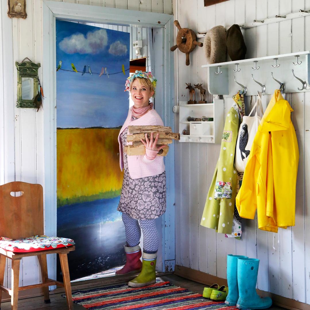 A színes és bohém otthon barátságos és hívogató. Érezhető, hogy az ott élők a lakás minden szegletét szeretik. A költőnő élettársa, Mikka Lappalainen (fotós) évek óta gyűjti a régi használati tárgyakat, amelyek az ódon faházban végre új életet kezdhettek.