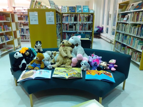 Az alábbi fotón azok a plüssállatkák láthatók, akik eredetileg is a könyvtárban töltik a mindennapjaikat. Hozzájuk csatlakozhatott a többi vállalkozó szellemű, könyvtárkedvelő játék, akiket a gyerekek február 13-án este 7-ig, azaz könyvtárzárásig vihettek be a Haminai Főkönyvtárba, majd másnap nyitáskor már mehettek is értük.